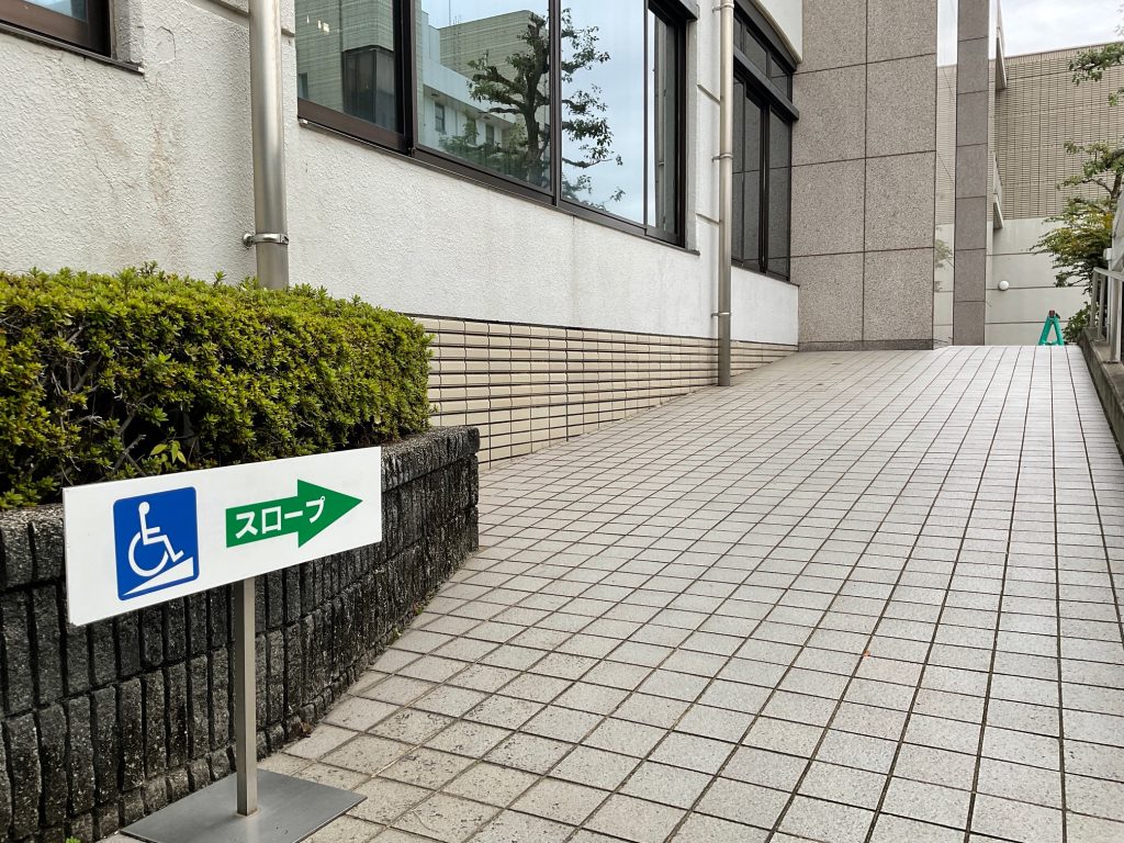正面玄関の横に、車いすの方等が利用しやすいようにスロープを設置しています。