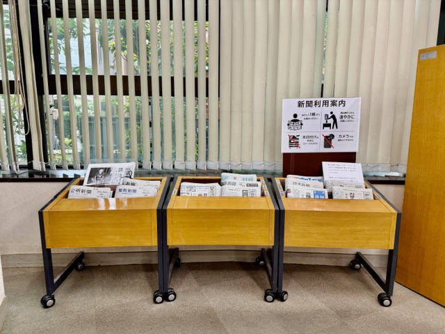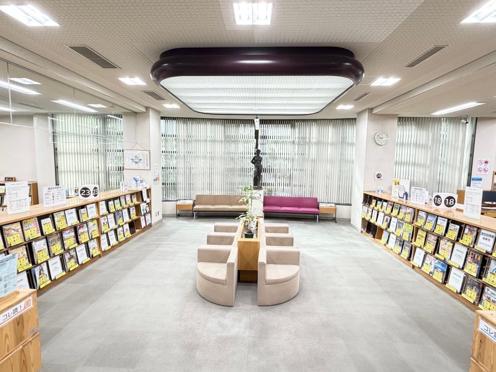 ソファに座ってゆったりと読書することができます。雑誌の書架があります。