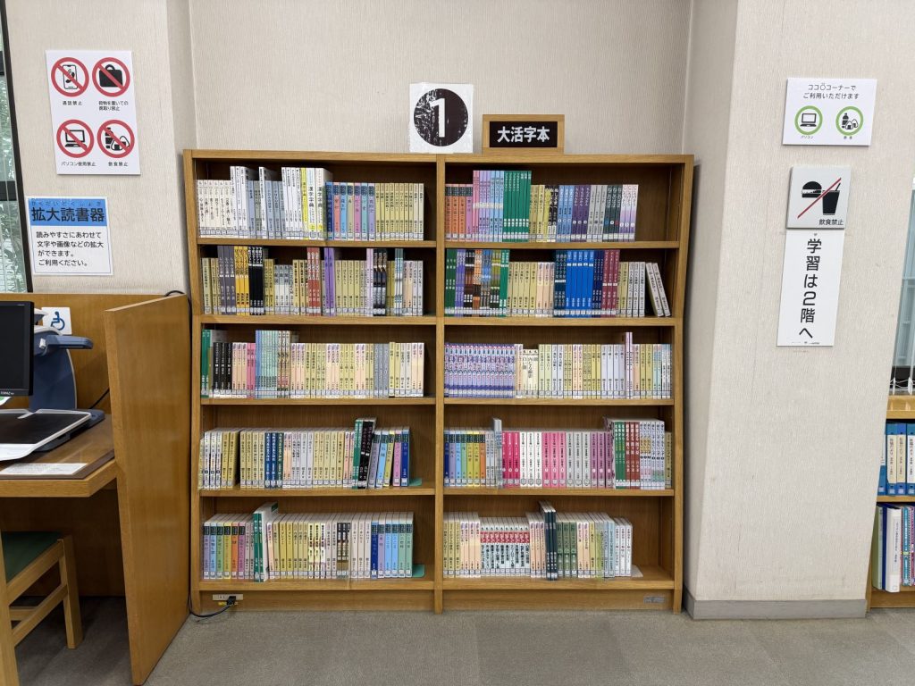 大活字本とは、通常の活字の大きさでは読みづらい方のために、大きな活字で印刷された図書のことです。目にやさしく、読みやすいため、多くの利用者に人気があります。