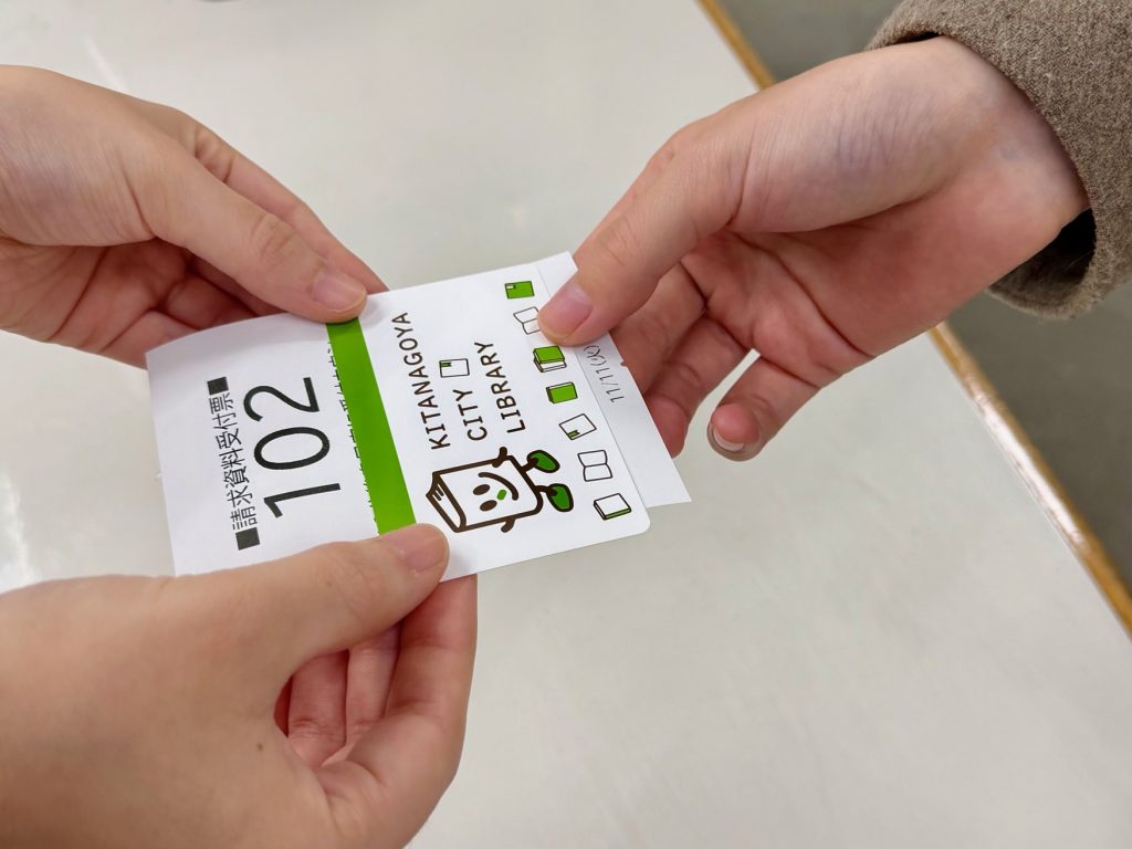 4.10分後を目安に、請求資料受付票と図書館カードを受付カウンターに出し、資料を受け取る。