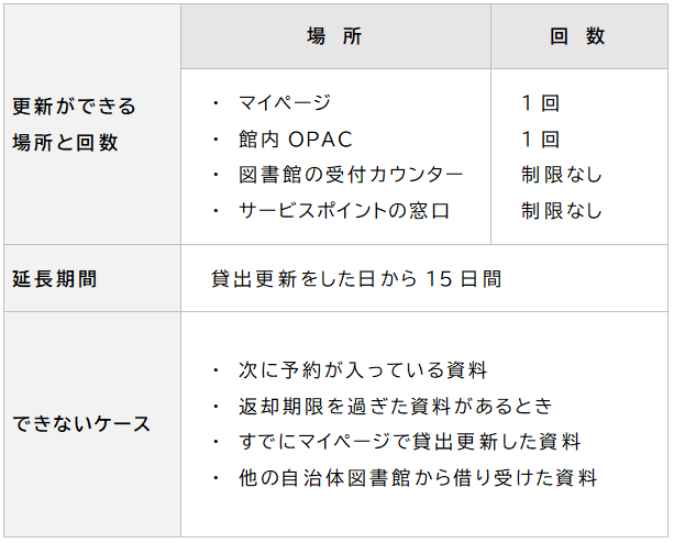 貸出中の資料を続けて利用したいときは、貸出更新をすると返却期限を延長できます。