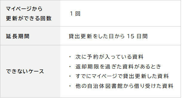 貸出中の資料を引き続き利用したい場合は、貸出更新を行うことで返却期限を延長できます。