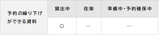 - 「在架」、「準備中」および「予約確保中」のときはネットからの変更はできません。変更を希望される場合は、図書館へお問い合わせください。