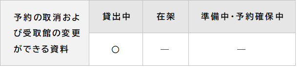 - ネットから予約の取消および受取館の変更ができるのは、資料が「貸出中」の場合のみです。