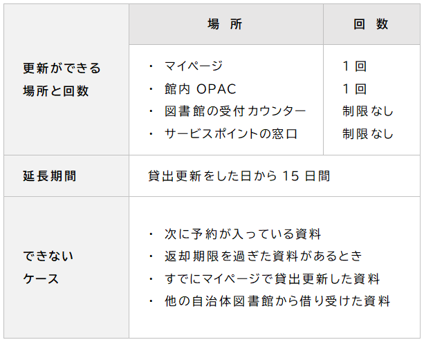貸出中の資料を続けて利用したいときは、貸出更新をすると返却期限を延長できます。