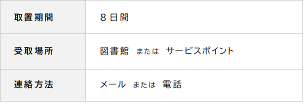 取り置き期限日までに貸出されない場合は、予約が取り消しされます。